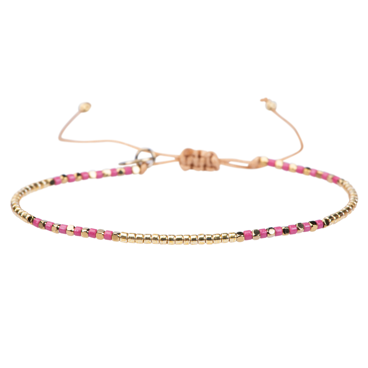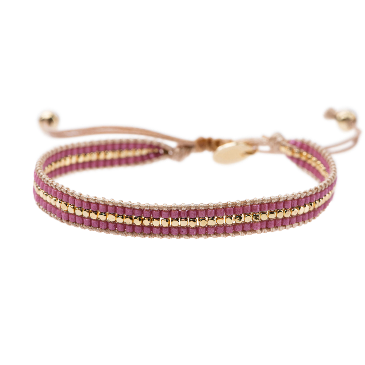 Deze leuke armband gemaakt van miyuki kralen in de kleuren cerise en goud is verstelbaar en past om iedere pols. Dit armbandje is makkelijk zelf aan en uit te doen.