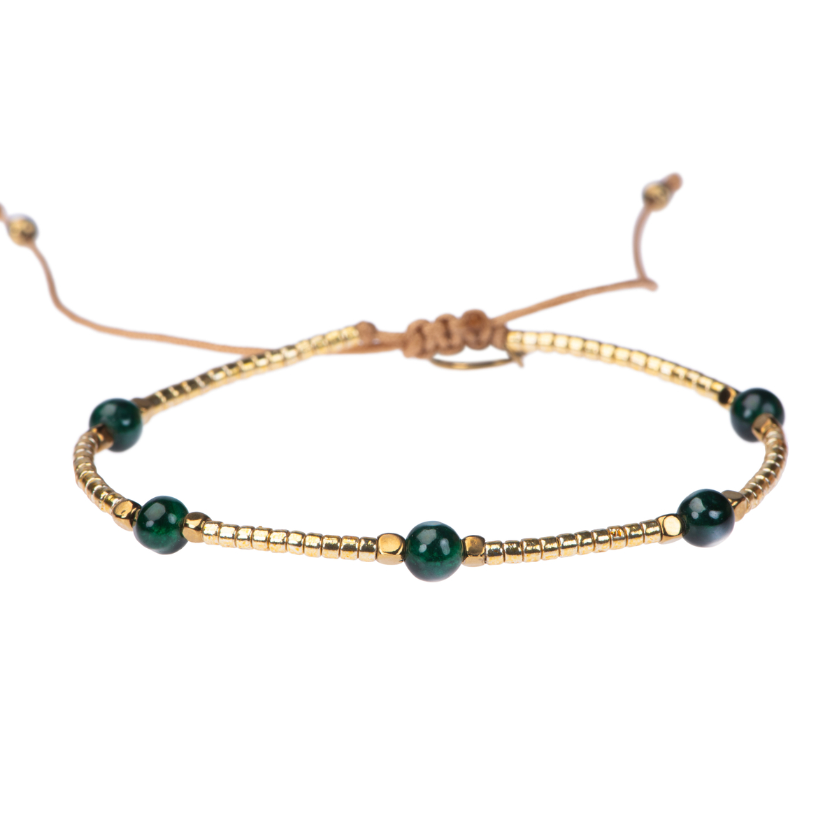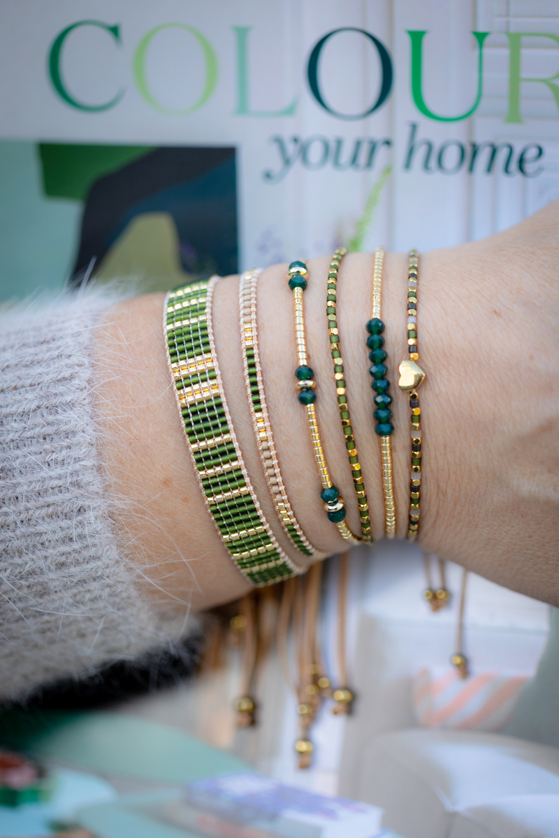 Deze leuke armband gemaakt van miyuki kralen in de kleuren groen en goud is een all time klassieker! Deze armband is makkelijk verstelbaar en past om iedere pols. Dit armbandje is makkelijk zelf aan en uit te doen.
