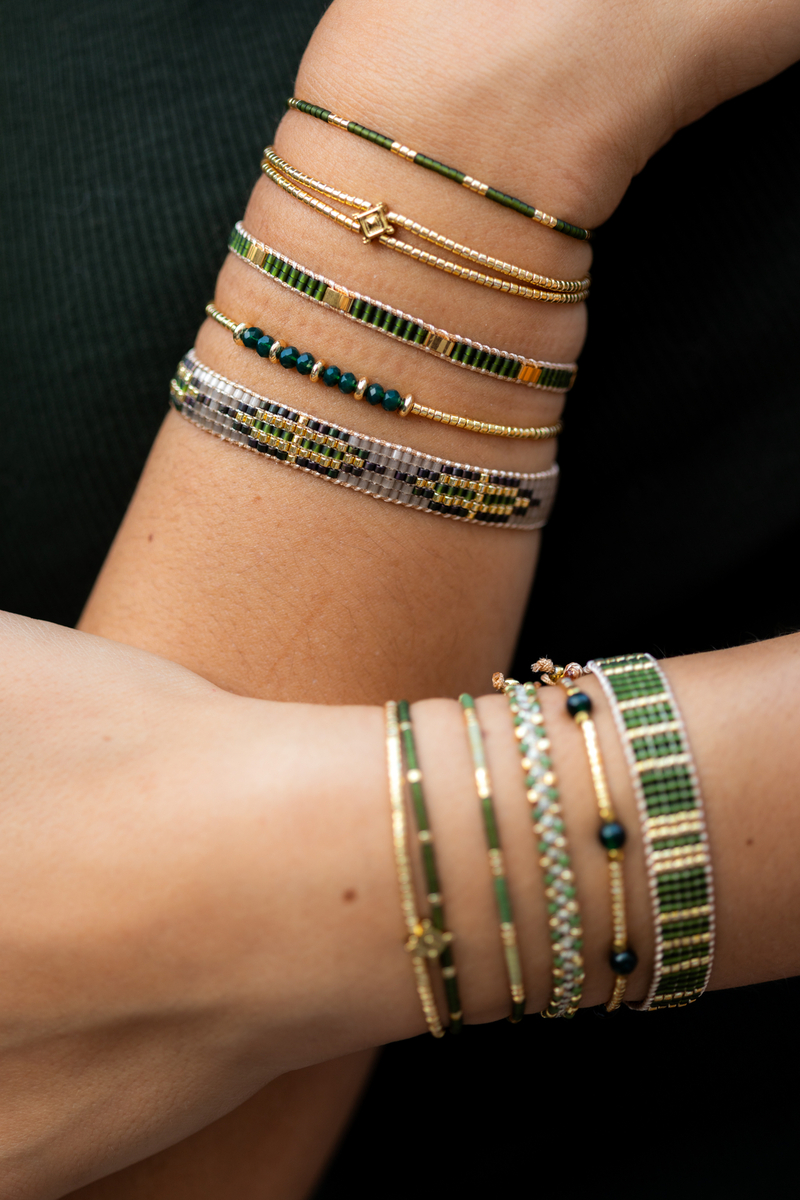 Dit mooie armbandje gemaakt van miyuki kraaltjes in de kleur groen / goud is verstelbaar en past om iedere pols. Dit armbandje is makkelijk zelf aan en uit te doen.
