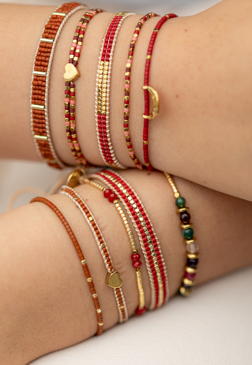 Dit mooie hart armbandje gemaakt van miyuki kraaltjes in de kleuren rood en goud is verstelbaar en past om iedere pols. Dit armbandje is makkelijk zelf aan en uit te doen.
