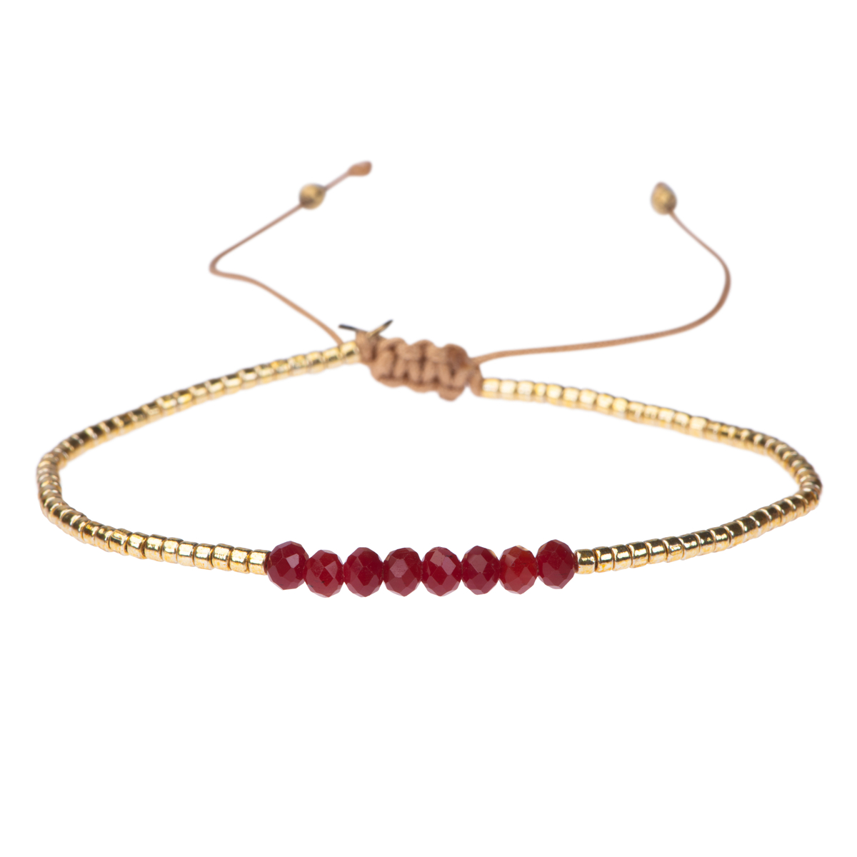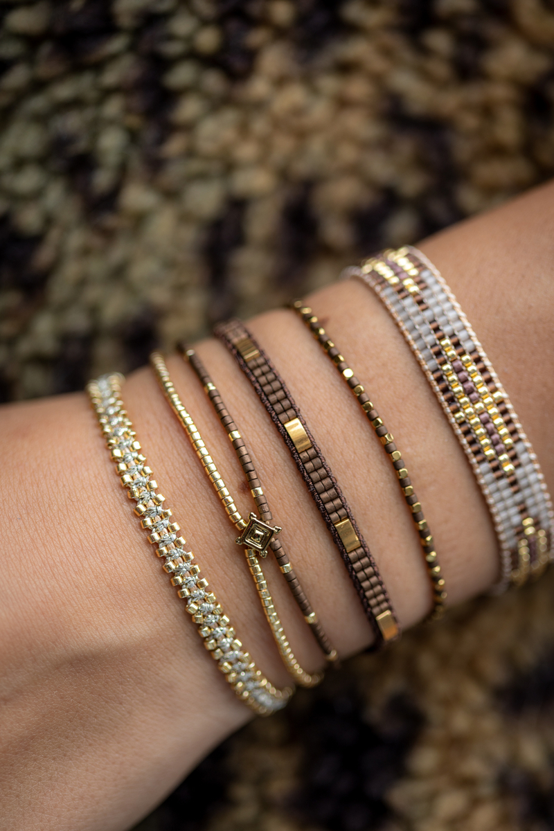 Dit mooie armbandje gemaakt van miyuki kraaltjes in de kleuren burgundy, silk en goud is verstelbaar en past om iedere pols. Dit armbandje is makkelijk zelf aan en uit te doen.