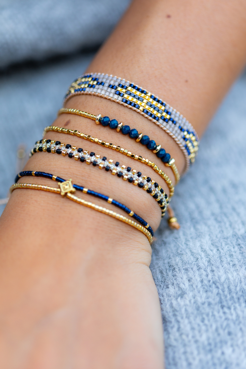 Dit mooie armbandje gemaakt van miyuki kraaltjes in de kleur blauw / goud is verstelbaar en past om iedere pols. Dit armbandje is makkelijk zelf aan en uit te doen.