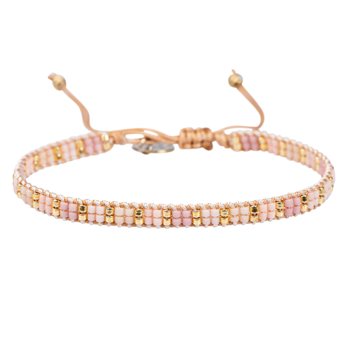 This beautiful bracelet made of miyuki beads in the color peach and gold with golden fantasy charm is adjustable and fits any wrist. This bracelet is easy to put on and take off yourself.