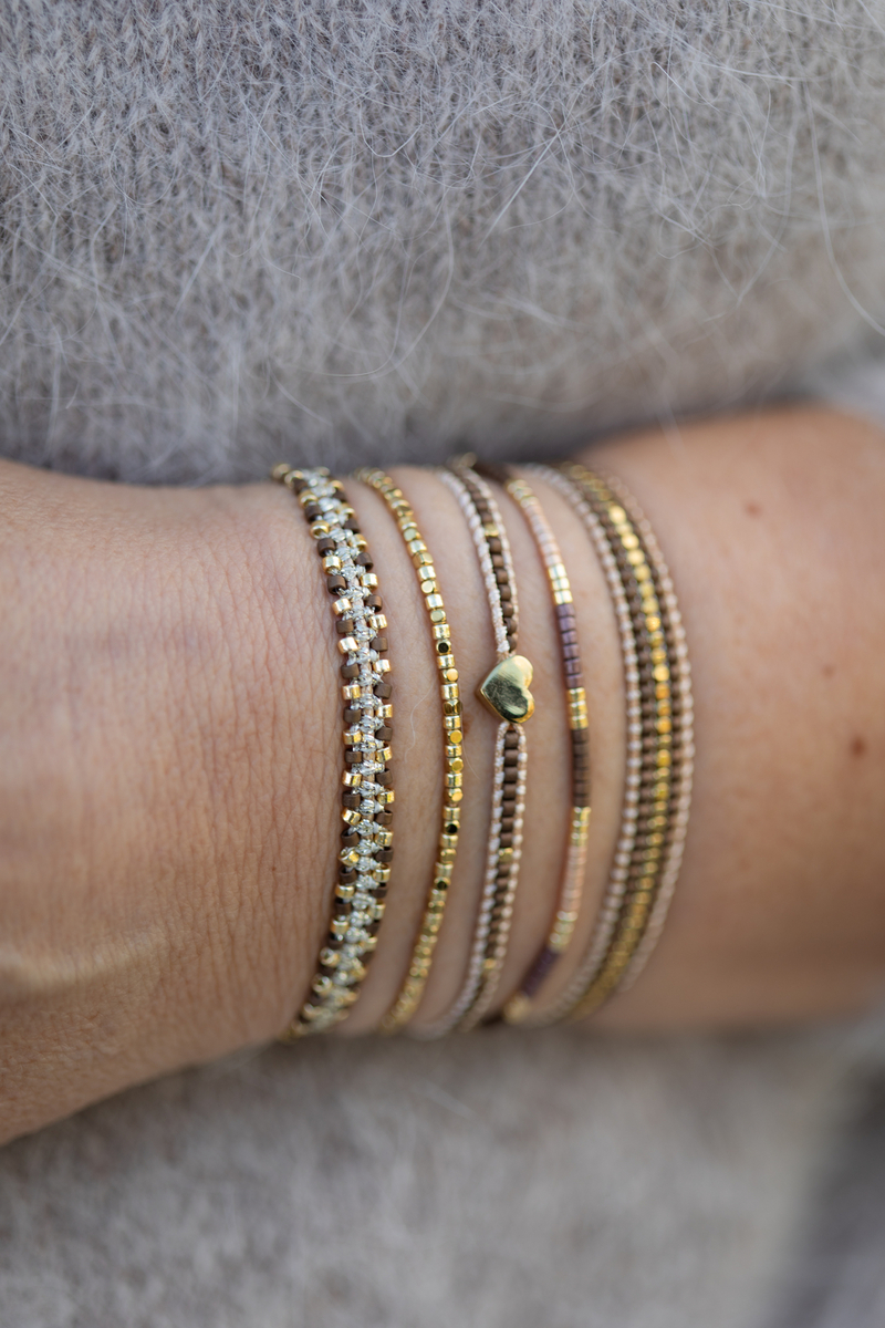 Dit mooie armbandje gemaakt van miyuki kraaltjes in de kleuren bruin, champagne en goud is verstelbaar en past om iedere pols. Dit mooie armbandje is makkelijk zelf aan en uit te doen.