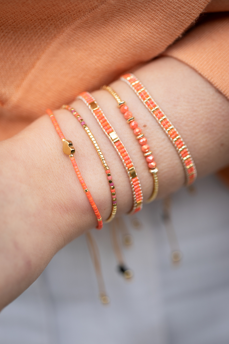 Dit mooie armbandje gemaakt van miyuki kraaltjes in de kleyur peach/orange, goud is verstelbaar en past om iedere pols. Dit armbandje is makkelijk zelf aan en uit te doen.