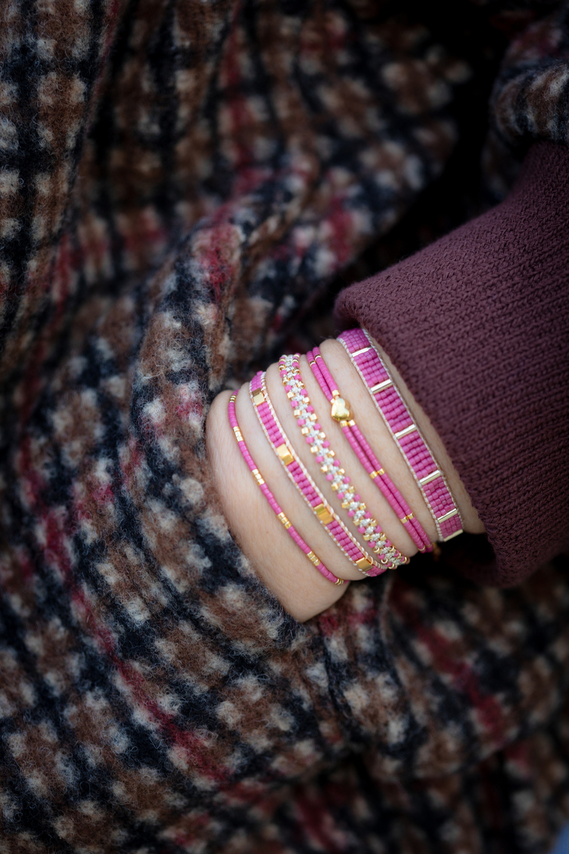 Dit mooie armbandje gemaakt van miyuki kraaltjes in de kleuren cerise / goud is verstelbaar en past om iedere pols. Dit armbandje is makkelijk zelf aan en uit te doen.