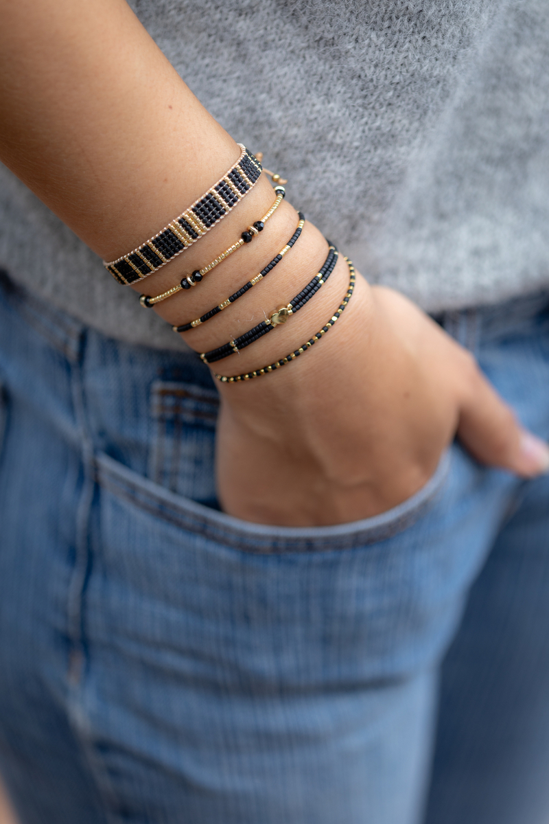 Dit mooie armbandje gemaakt van miyuki kraaltjes in de kleuren zwart en goud is verstelbaar en past om iedere pols. Dit armbandje is makkelijk zelf aan en uit te doen.