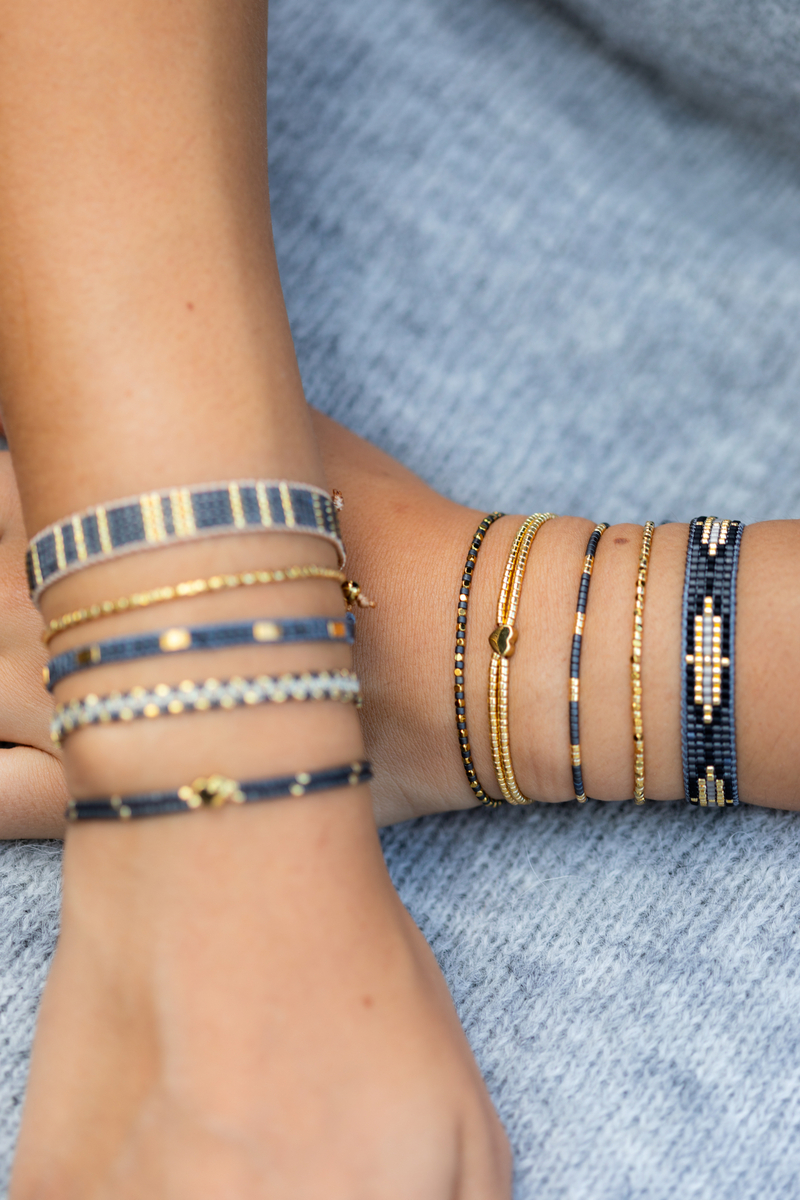 Dit mooie armbandje gemaakt van miyuki kraaltjes in de kleuren grijs en goud is verstelbaar en past om iedere pols. Dita armbandje is makkelijk zelf aan en uit te doen.