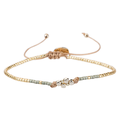 Dit mooie armbandje gemaakt van miyuki kraaltjes in de kleuren groen en goud is verstelbaar en past om iedere pols. Dit armbandje is makkelijk zelf aan en uit te doen.