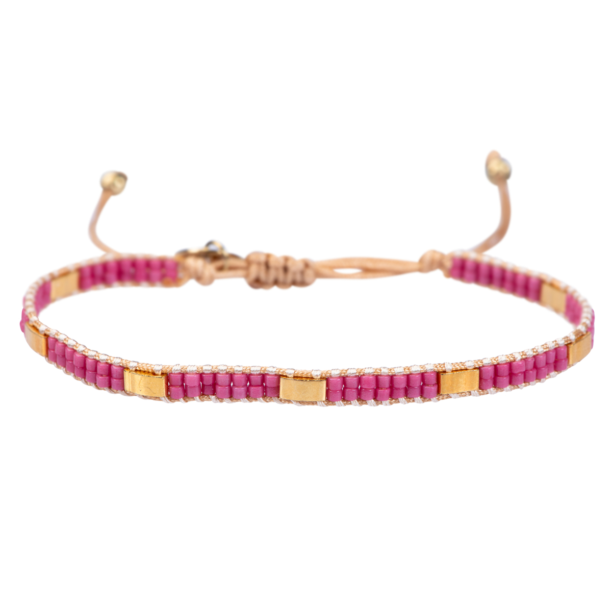 Dit mooie armbandje gemaakt van miyuki kraaltjes in de kleur cerise/goud is verstelbaar en past om iedere pols. Dit armbandje is makkelijk zelf aan en uit te doen.